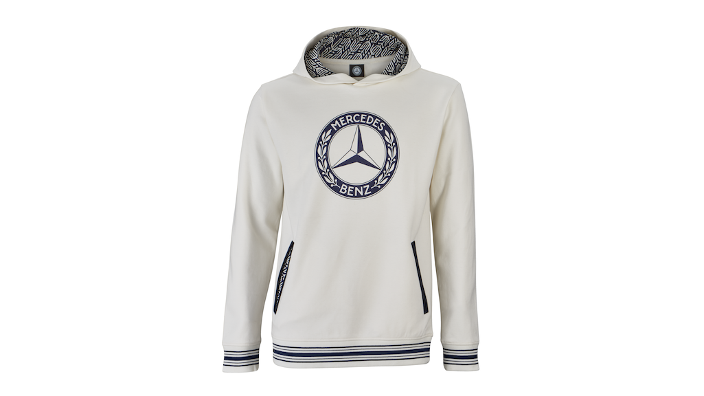 Questa felpa con cappuccio bianco sporco e navy offre un comfort piacevole per i giorni freddi. Ha una vestibilità Modern Fit e dettagli ricercati come l'interno del cappuccio e della tasca a marsupio in navy con stampa della Foglia d'alloro storica.