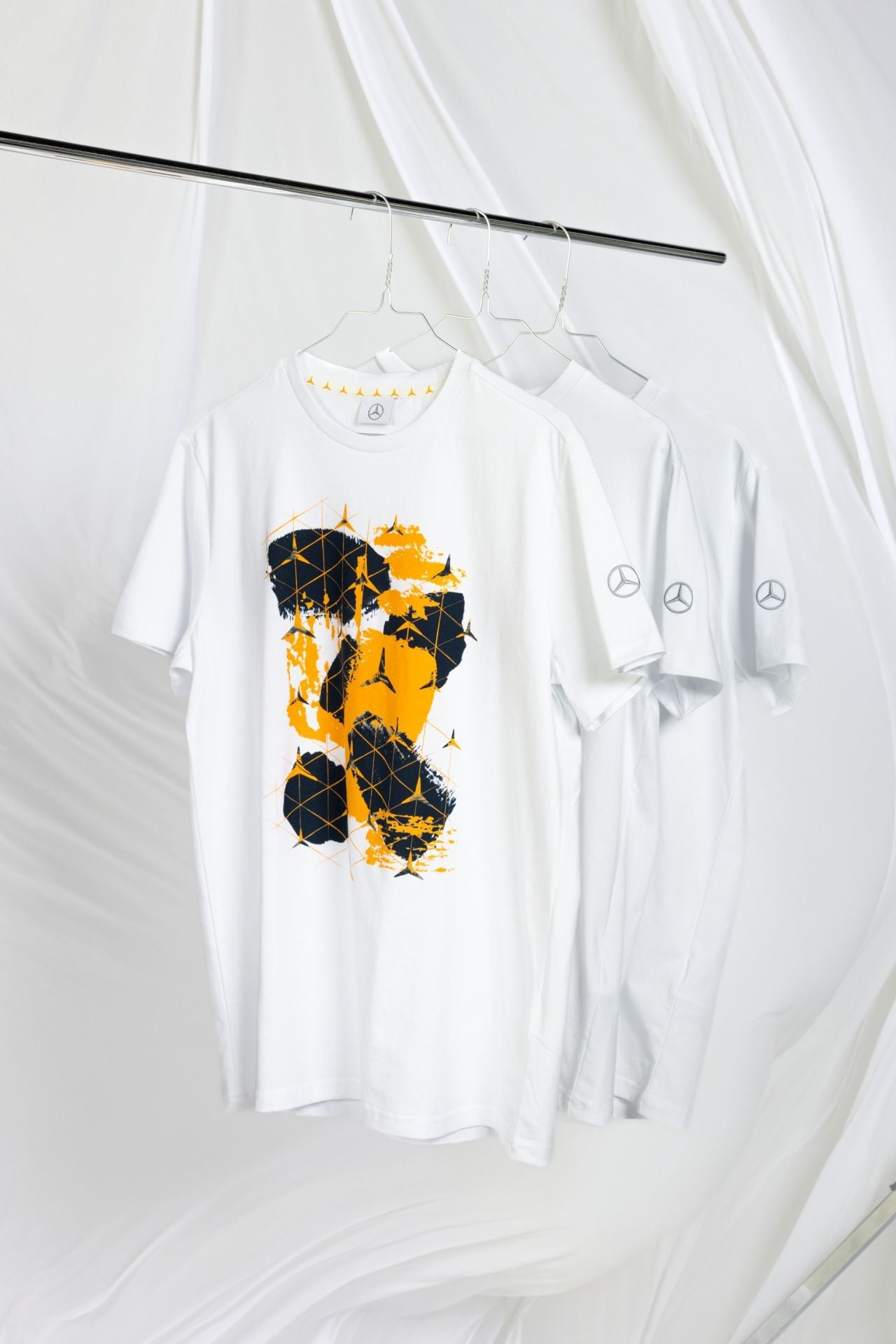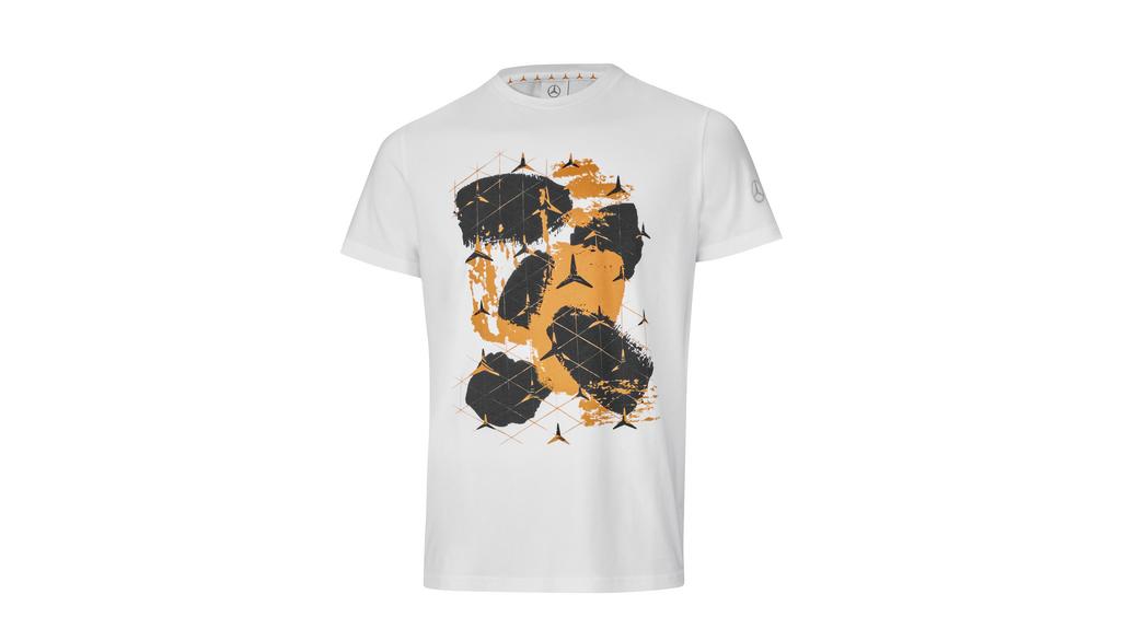 La T-shirt unisex bianca, realizzata in puro cotone biologico e con una comoda vestibilità Modern Fit, garantisce una piacevole vestibilità. La maglietta presenta un scollo rotondo e sul davanti un grande motivo a stelle in arancione e blu scuro. Il suo design accattivante è completato da una Stella Mercedes ricamata sulla manica sinistra.